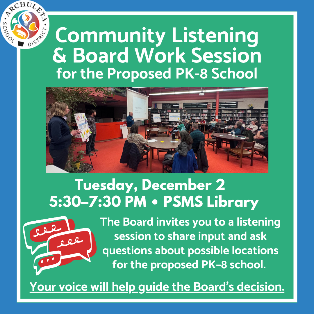 To ensure community and staff voices help inform the decision, the Board of Education will host two listening and work sessions. These sessions will provide opportunities for questions, input, and feedback on the site options before a final location is selected.